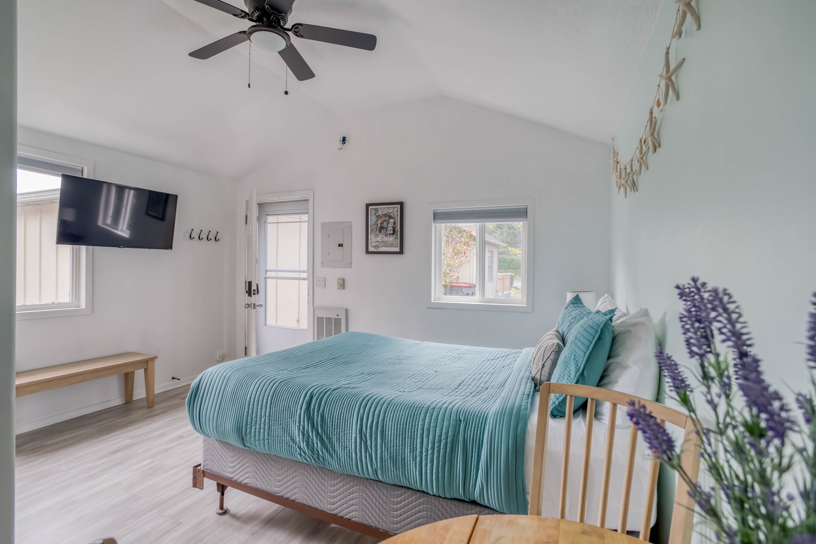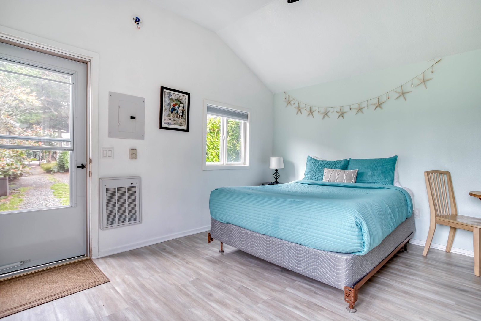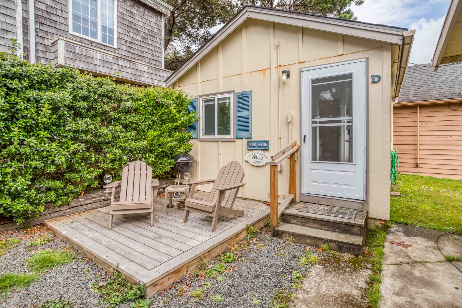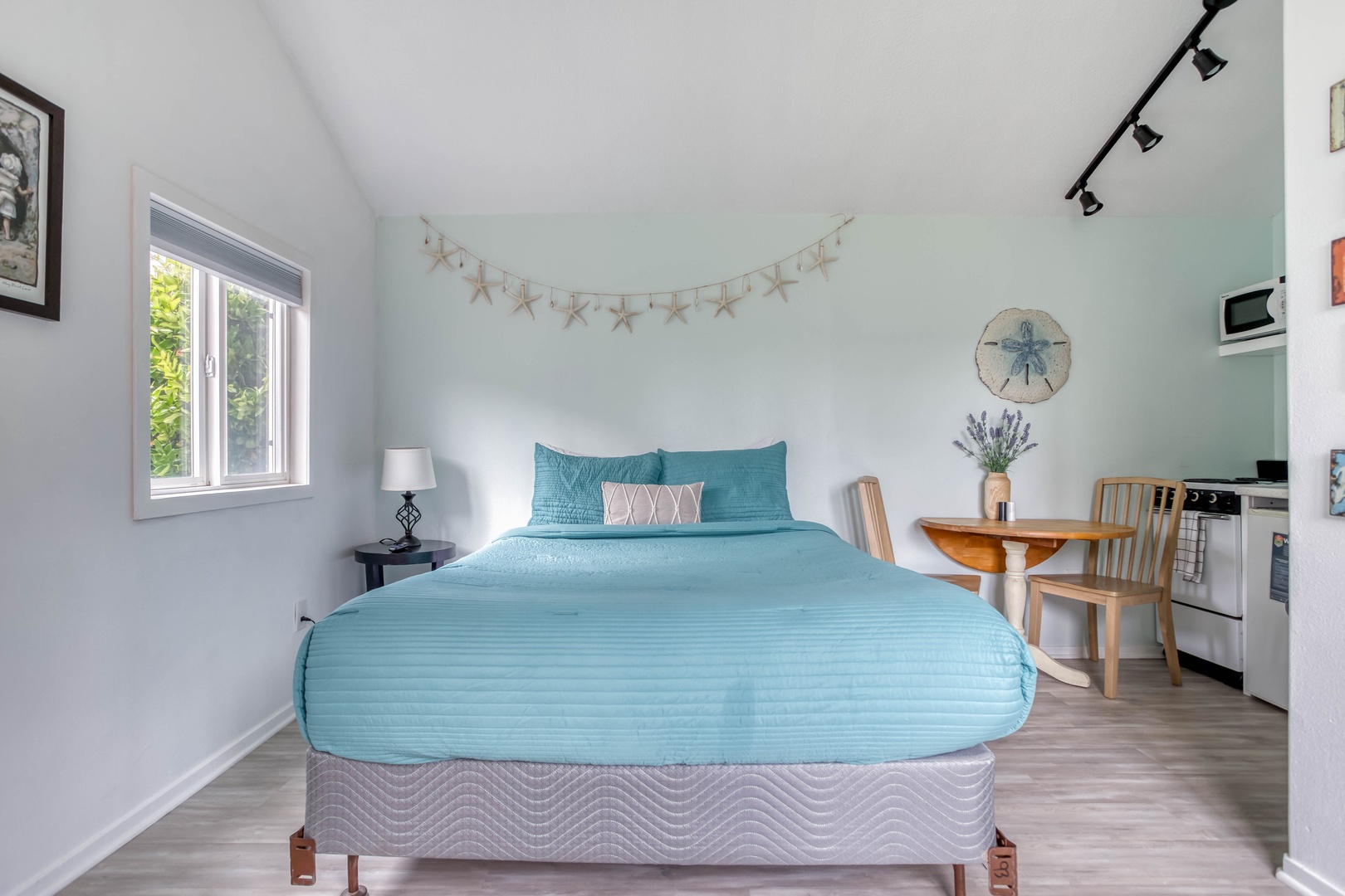 When you’re looking for the perfect spot to explore the beach and the heart of downtown, Cannon Beach’s Gull’s Nest Cottage might just be your perch! Located between mid-town and downtown and just a block to the expansive beach around Haystack Rock, this sweet, free-standing one-level home has all you’ll need for unwinding on the coast. With a queen bed, full bath and even a sweet kitchenette and dining table, this studio is remarkably well equipped. A wood deck in front lets you relax in Adirondack chairs and grill on the charcoal barbecue while you watch pedestrians stroll by on the sidewalk. When you’re ready to explore downtown, walk three blocks north and you’ll be surrounded by enticing shops, inviting restaurants, and gallery windows bright with wonderful artwork. It’s a great place to stay if you’d like to avoid more driving, but if you also plan to explore the North Coast, you’ll find yourself minutes to Seaside and Astoria to the north, and Manzanita and fantastic hiking and beaches to the south.