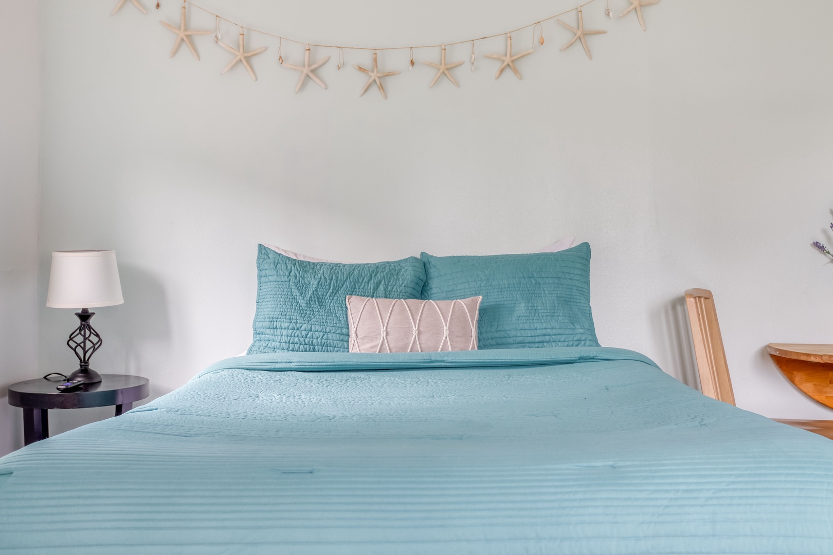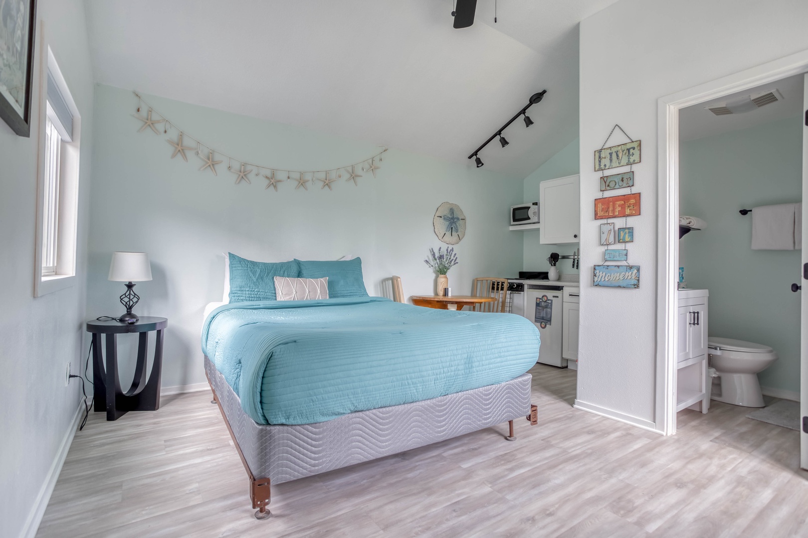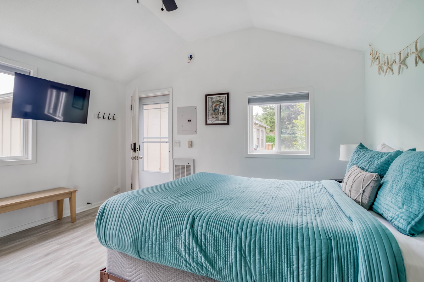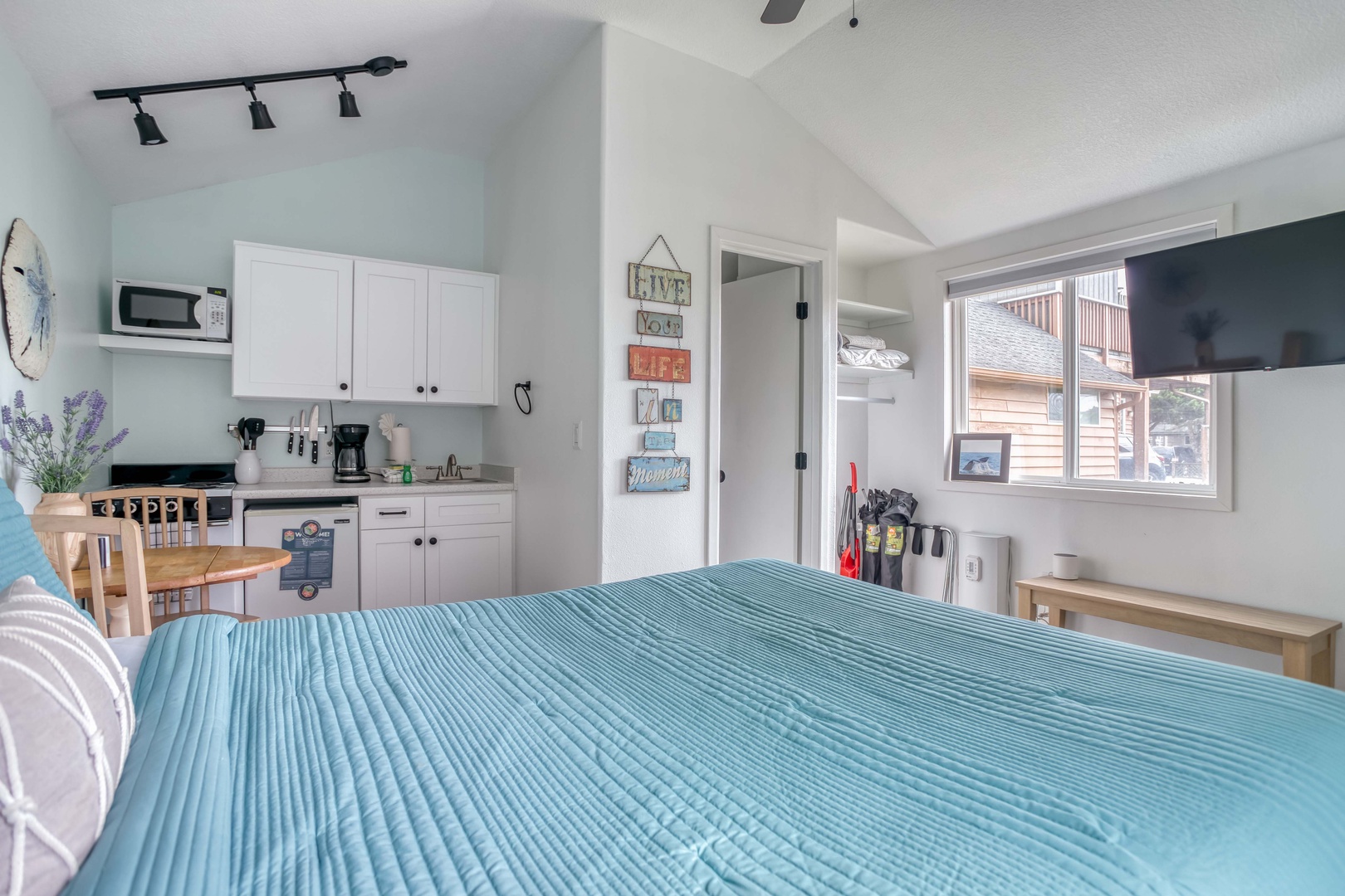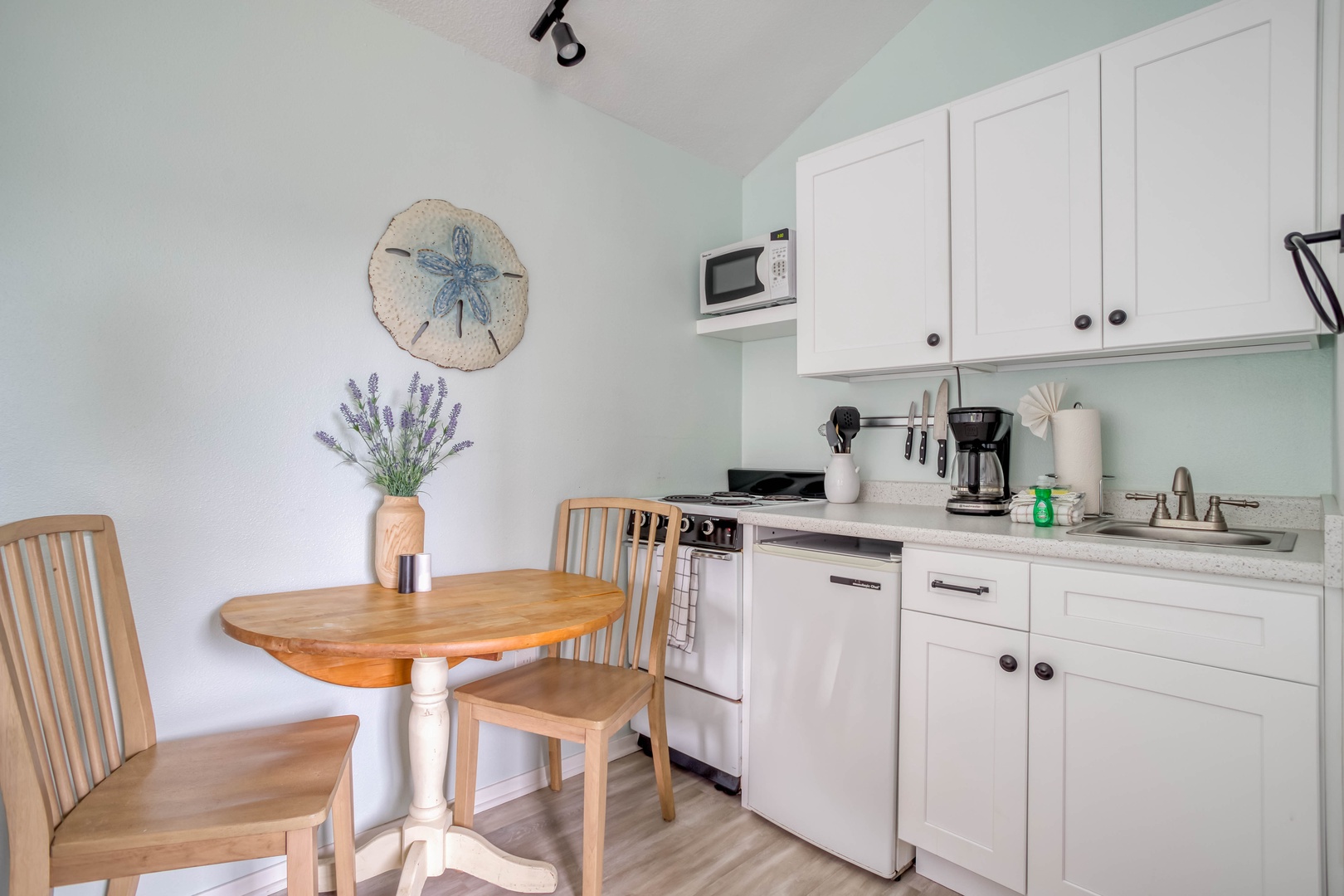When you’re looking for the perfect spot to explore the beach and the heart of downtown, Cannon Beach’s Gull’s Nest Cottage might just be your perch! Located between mid-town and downtown and just a block to the expansive beach around Haystack Rock, this sweet, free-standing one-level home has all you’ll need for unwinding on the coast. With a queen bed, full bath and even a sweet kitchenette and dining table, this studio is remarkably well equipped. A wood deck in front lets you relax in Adirondack chairs and grill on the charcoal barbecue while you watch pedestrians stroll by on the sidewalk. When you’re ready to explore downtown, walk three blocks north and you’ll be surrounded by enticing shops, inviting restaurants, and gallery windows bright with wonderful artwork. It’s a great place to stay if you’d like to avoid more driving, but if you also plan to explore the North Coast, you’ll find yourself minutes to Seaside and Astoria to the north, and Manzanita and fantastic hiking and beaches to the south.
